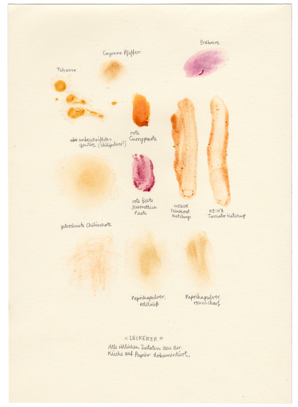 Die vielen hässlichen, aber nicht künstlerisch dokumentierten Emotionen der letzten drei Tage führten zu einem gleichsam hässlichen Bild. Als Zeitverschwendung fiel mir nur ein, da weiter zu machen, wo ich vier Tage zuvor aufhörte: Nach Farben sortierte Nahrungsmittel, die ich in der Küche finden konnte, zu sammeln und zu dokumentieren. Selbst die Ablenkung, an der ich sonst Gefallen fand, klingt freudlos.